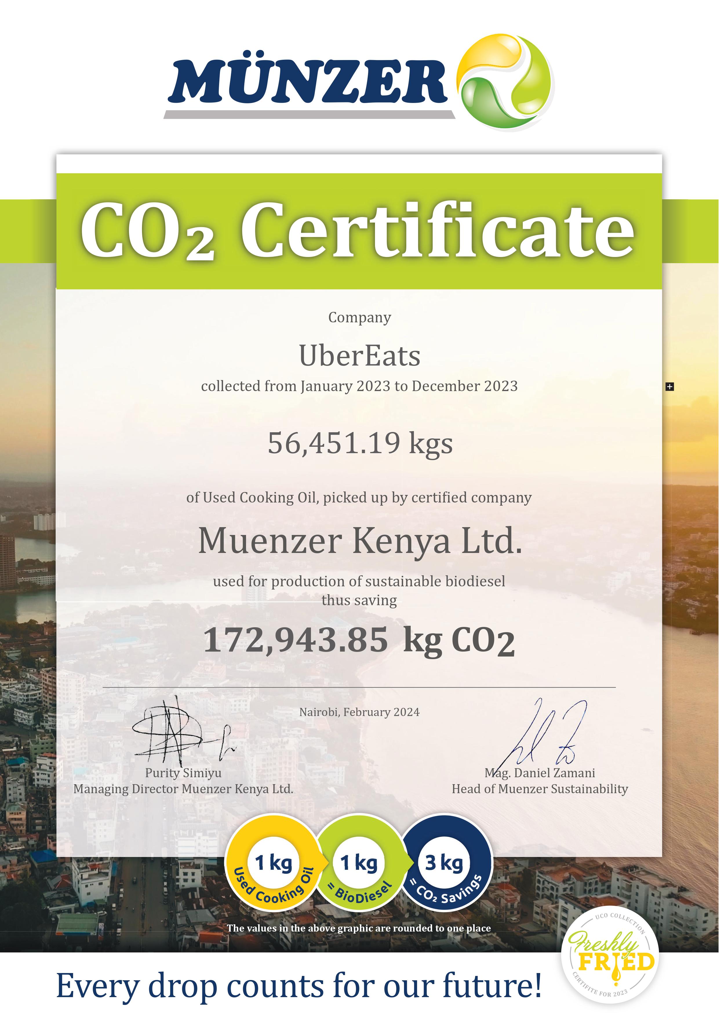 Uber Eats is a key player in this initiative, as this platform can be used to reach a growing number of catering businesses and customers. Another key player is Muenzer Kenya, whose disposal system ensures that used cooking oil is removed from the food cycle and professionally processed into renewable energy. Handing over the CO2 certificate for 2023 is an important step that shows the impact that can be made by working together to achieve a common goal. Together with the Uber Eats network, Muenzer Kenya has collected almost 60,000 kilos of used cooking oil and turned it into renewable energy. This saved almost 173 tons of CO2.
