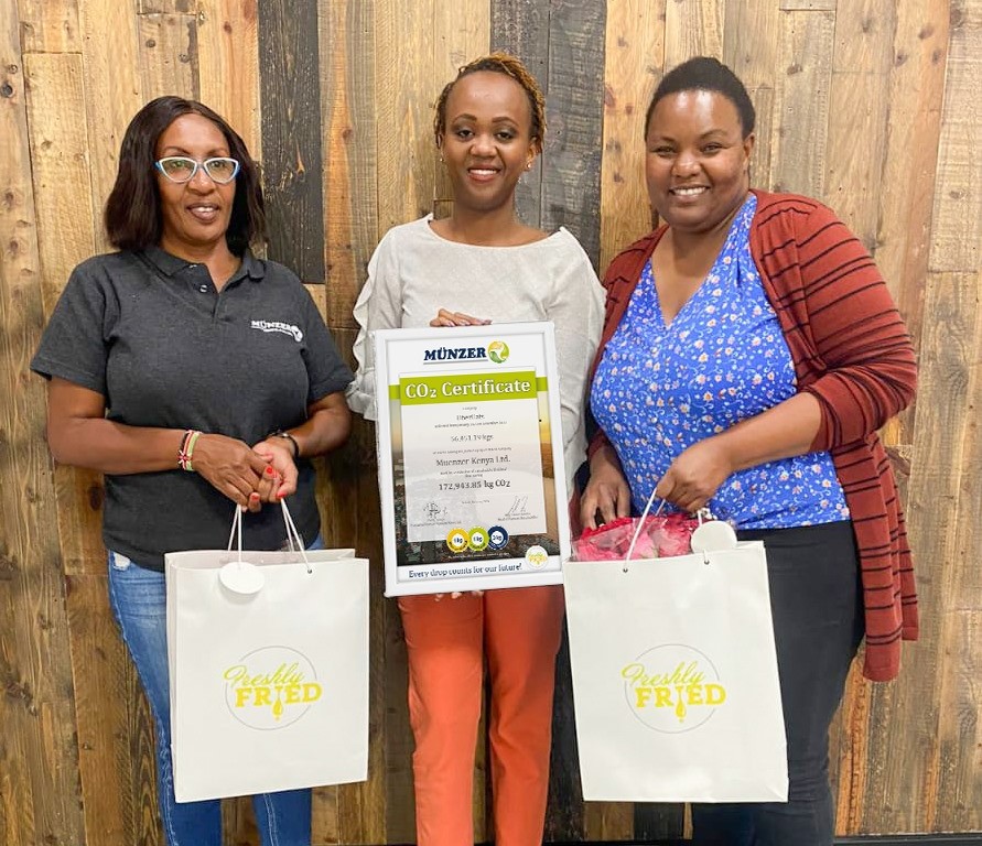 Leah Mweru (Muenzer Kenya; left) and Winnyrose Imbali (Muenzer Kenya; right) handed over the CO2 certificate to Lindah Mueni (Uber Eats; center)
