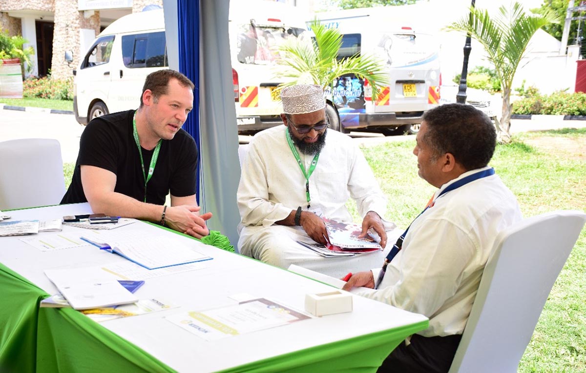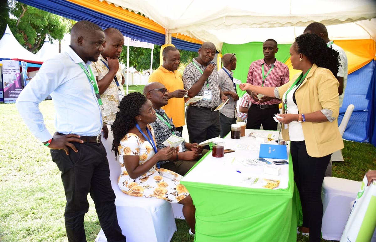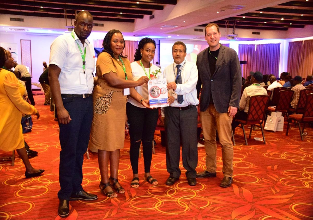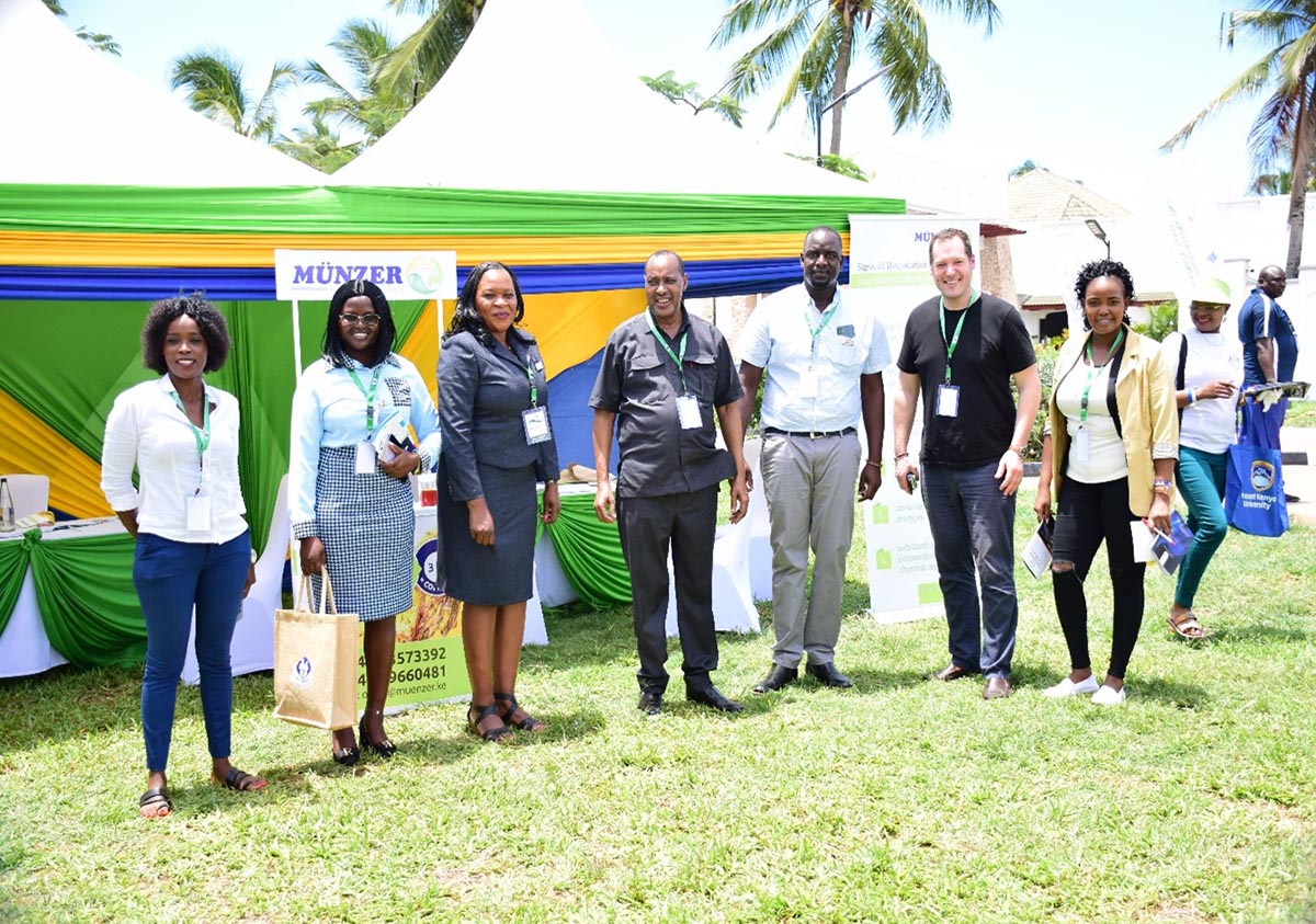 Münzer Kenya Pvt team at their booth with Ms. Rhoda Jeptoo, Public Health Officer at Kenyatta University Teaching Referral and Research Hospital (KUTRRH) and Mr. Mohammed Duba, Secretary General Association of Public Health Officers (APHOK) during the First Public Health International Conference held at Pride Inn Paradise beach hotel – Mombasa County